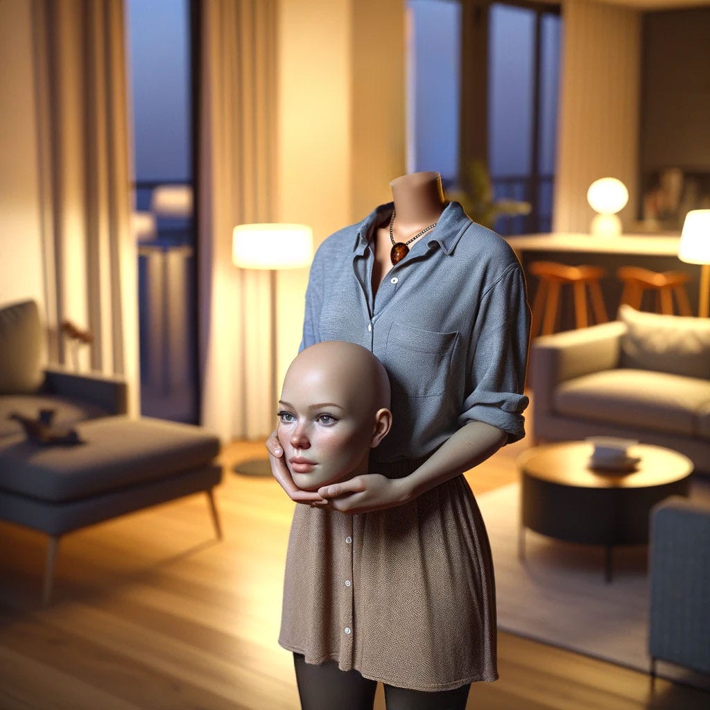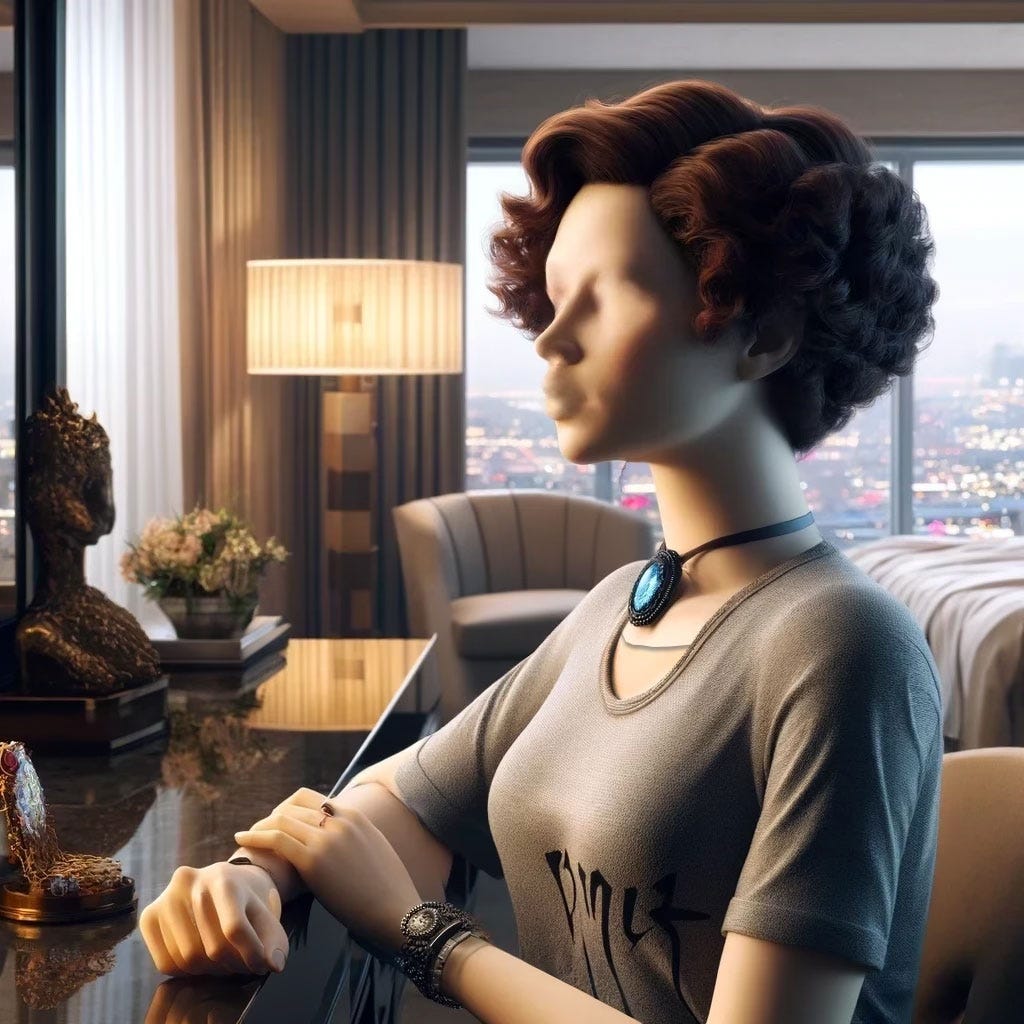 I don’t need to be asked twice. I quickly remove my black wig and reach behind my head, finding the release button. The room goes dark as I hastily lift off the loquette, wobbling a bit at the sudden loss of visual input. Dave puts his hand on my back steady me as I slide the new head into place, feeling it tighten securely around my neck stem. There’s some hard thing pressing against the top of my neck stem—an unfamiliar sensation. Before I can question it, Dave replaces the loquette.